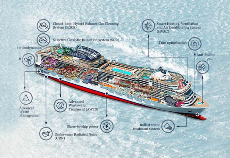 • MSC Virtuosa je vybavená podvodným systémom vyžarovania hluku, ktorý minimalizuje akustický zvukový dopad a znižujú potenciálne účinky na morskú faunu, najmä na morské cicavce v okolitých vodách.