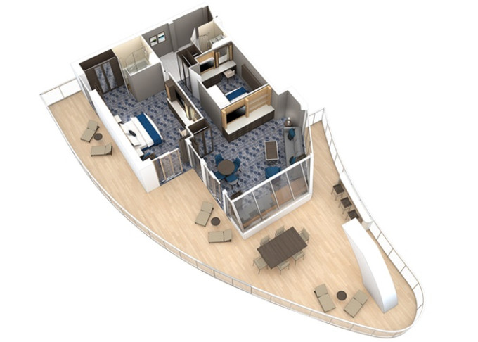 | A2 - AquaTheatre Suite s balkónom / 2 spálne 62,5 m² + balkón 56 m². 9,10. paluba vzadu. Max 8 osôb. Výhody Royal Suite Star Class. | 26 314 € 13 157 € za osobu | ||